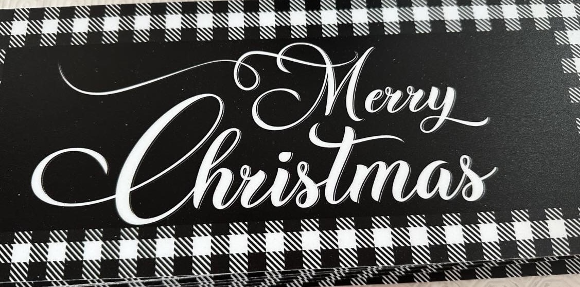 Waterproof, UV protected foamex plaque. Suitable for both indoor and outdoor use. Two holes for easy attachment. 12 by 5 inches. Ideal for Christmas deco.