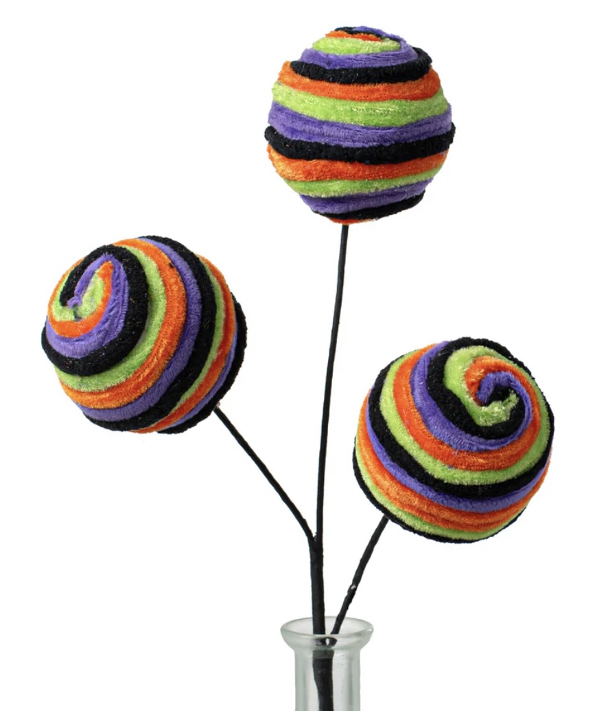This spray has three foam balls wrapped in spiraled orange, purple, green and black chenille stripes.