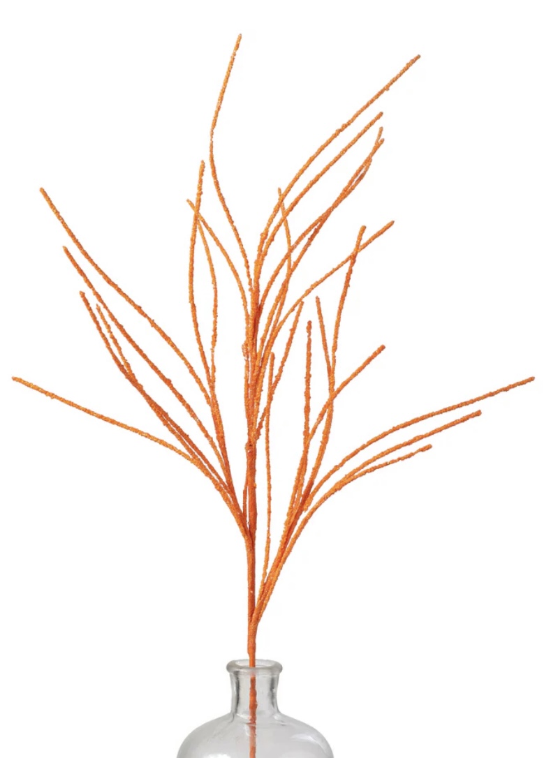 Naturally wavy, thick filaments are coated with an orange, bubbly texture and iridescent glitter.