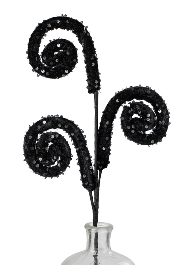 This spray has three wired, foam tubes that are wrapped in black velvet and dotted with black sequins.