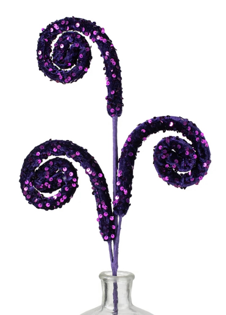 This spray has three wired, foam tubes that are wrapped in purple velvet and dotted with purple sequins.