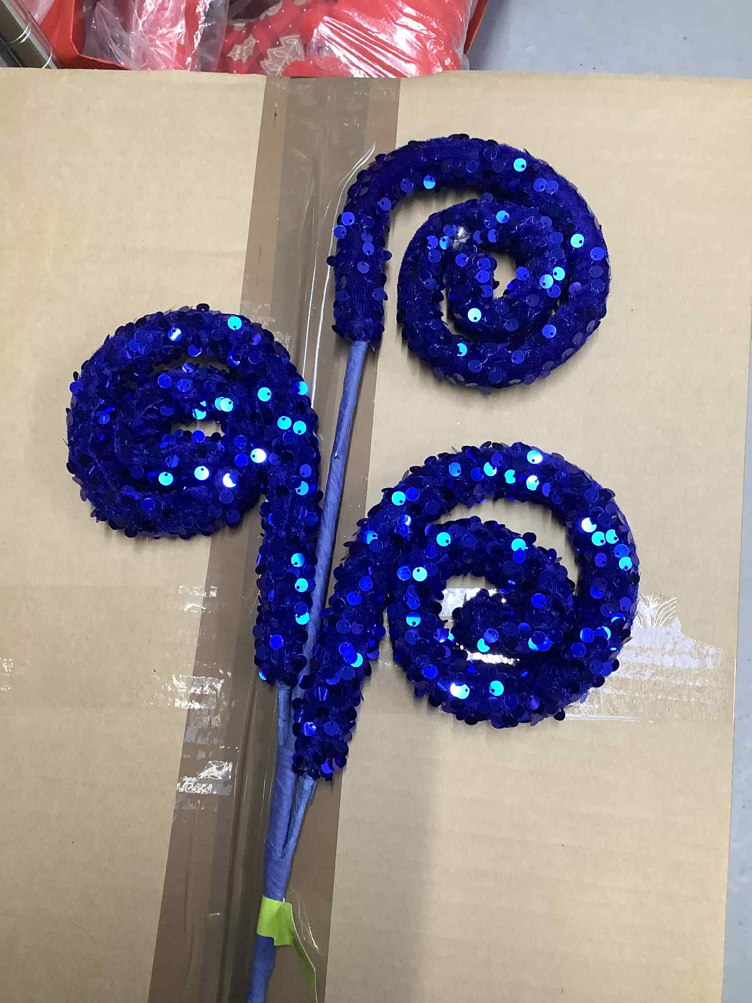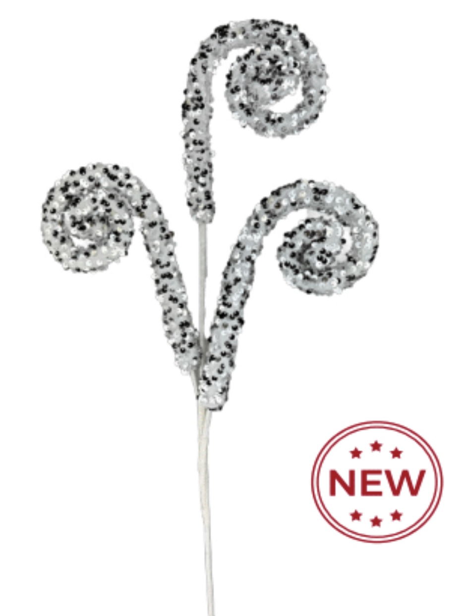This spray has three wired, foam tubes that are wrapped in silver velvet and dotted with silver sequins.
