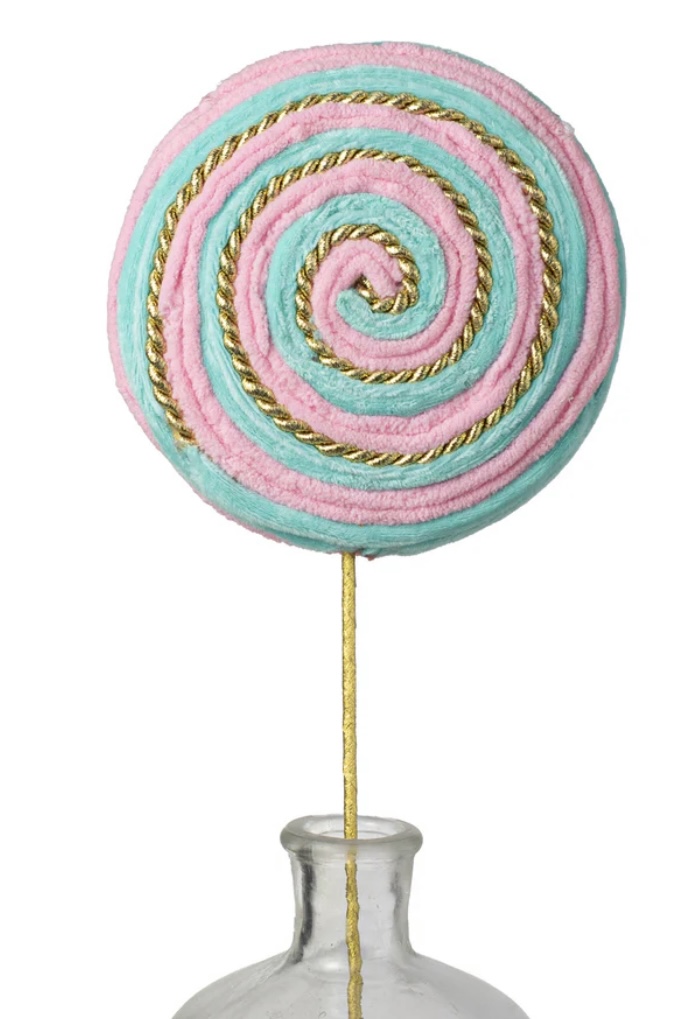 This lollipop is covered with blue velvet strips, pink chenille and metallic gold cording, all spiraling into the center. The lollipop is double-sided - it looks the same on the front and the back.
