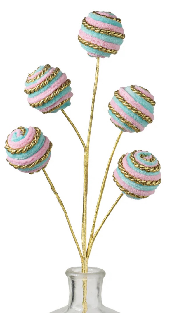 Blue velvet strips, pink chenille, and metallic gold cording are spiraled around five foam balls.