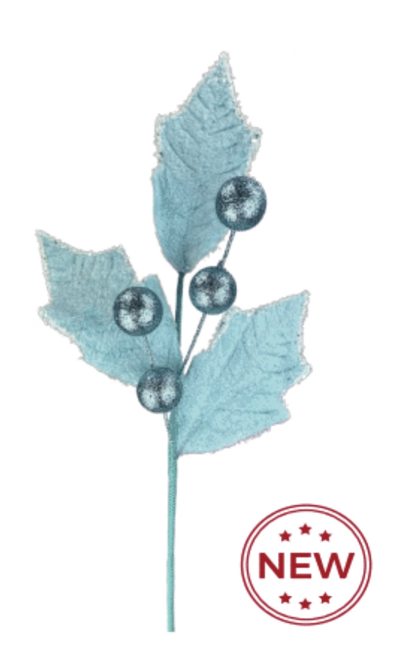 Three velvet blue leaves with glittered edging finished with four metallic glittered balls.
