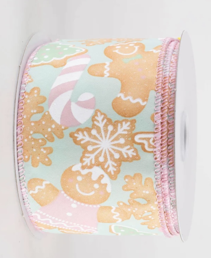Mint green, pink and white gingerbread men and sugar cookies in classic Christmas shapes like trees, snowflakes and candy canes fill this mint green canvas ribbon.