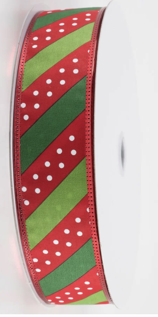 Red and Green Satin Dots and Diagonal Stripe Ribbon