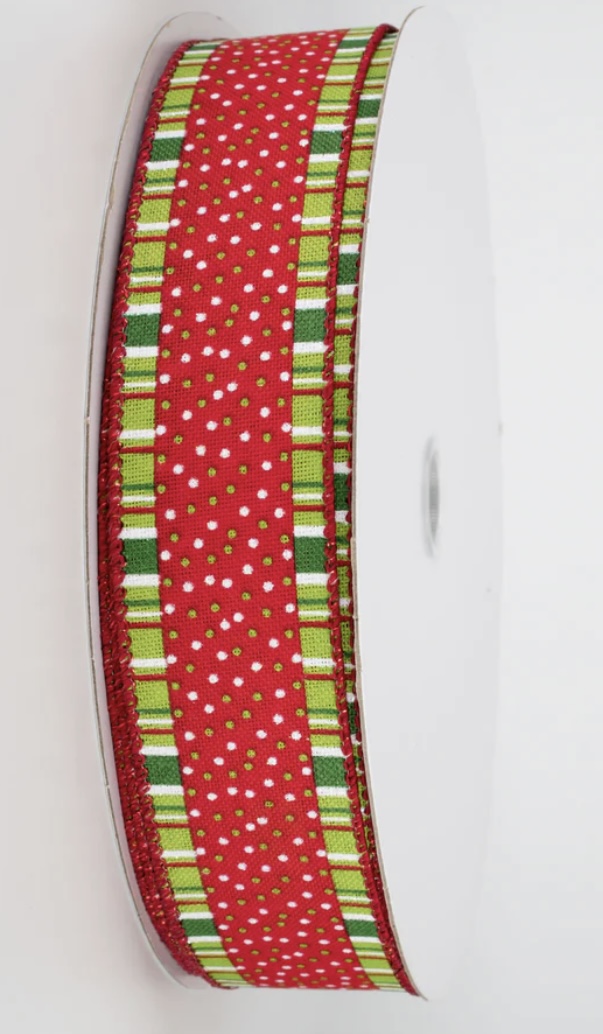 This cheerful canvas ribbon has a central band of tiny polka dots sandwiched between bands of horizontal stripes.