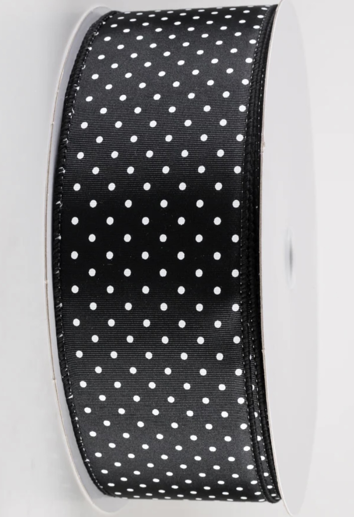 This black ribbed satin ribbon has a pattern of white, screen printed Swiss dots.