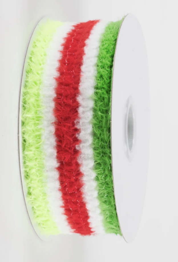 Fluffy strips of chenille are woven into a clear nylon grid creating a ribbon that is soft to the touch.