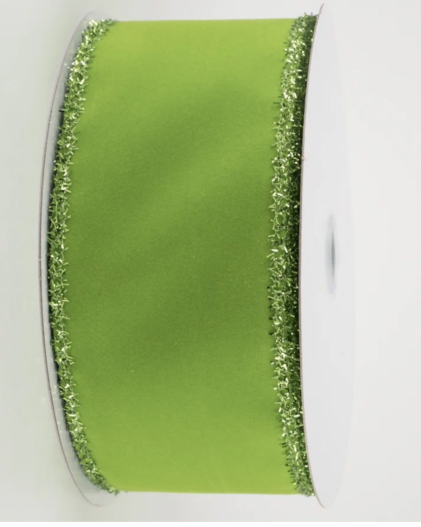 This faux velvet, lime green ribbon is holiday-ready with sparkly, tinsel edges in the same colour.