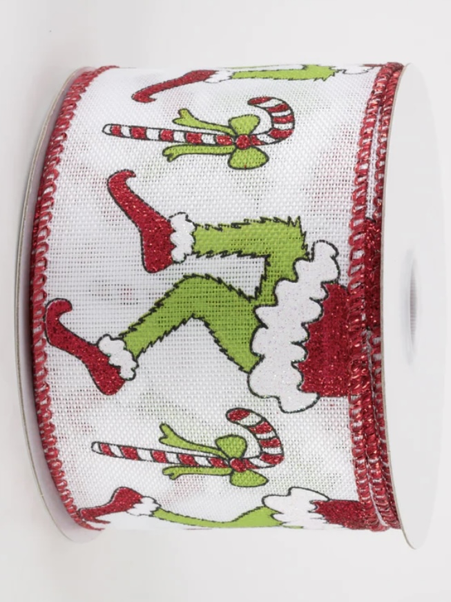 The legs of a green Christmas monster wearing a glittery Santa suit appear to tiptoe across this white canvas ribbon.