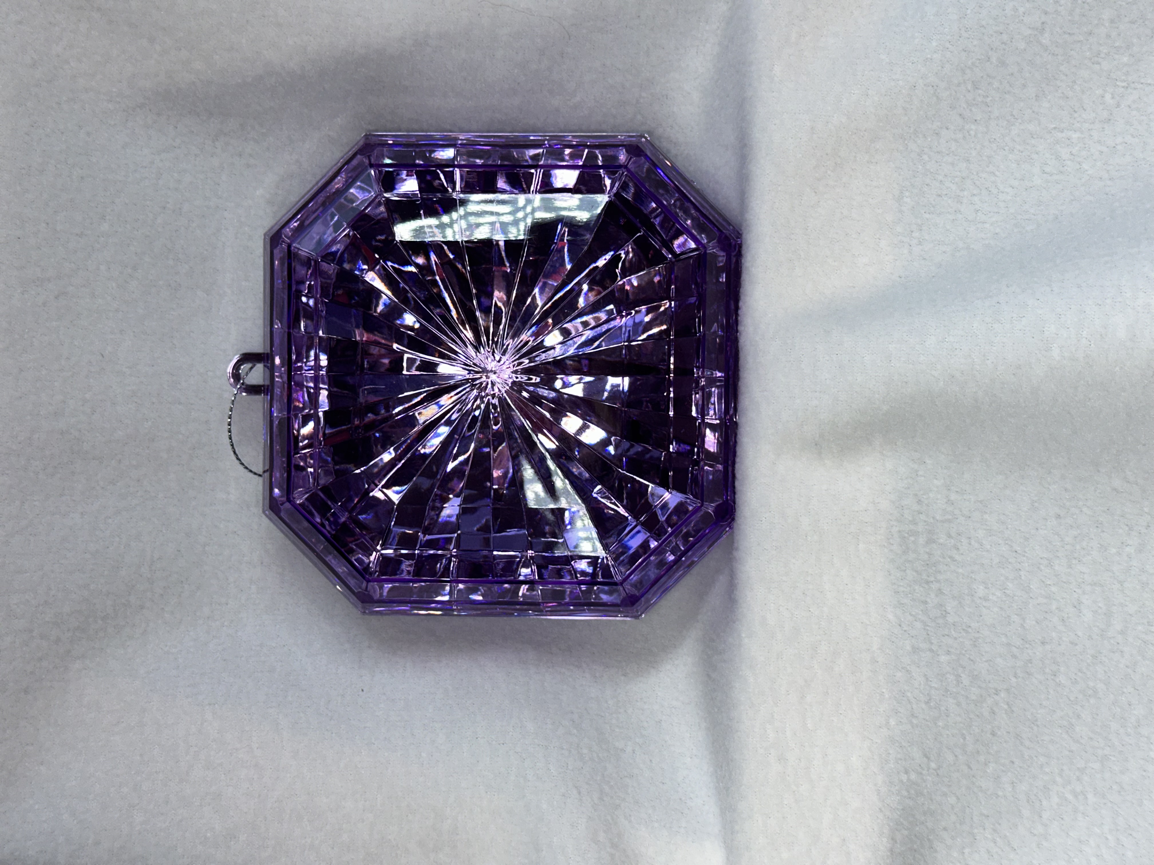 Acrylic jewels. Off set square shaped. Sturdy. Beautifully cut and designed. Ideal for all occasions. Bright and shiny. 12cm x 13cm. Purple in colour. Small hook at the top to attach. Decorative attachment. For wreaths, garlands, etc.