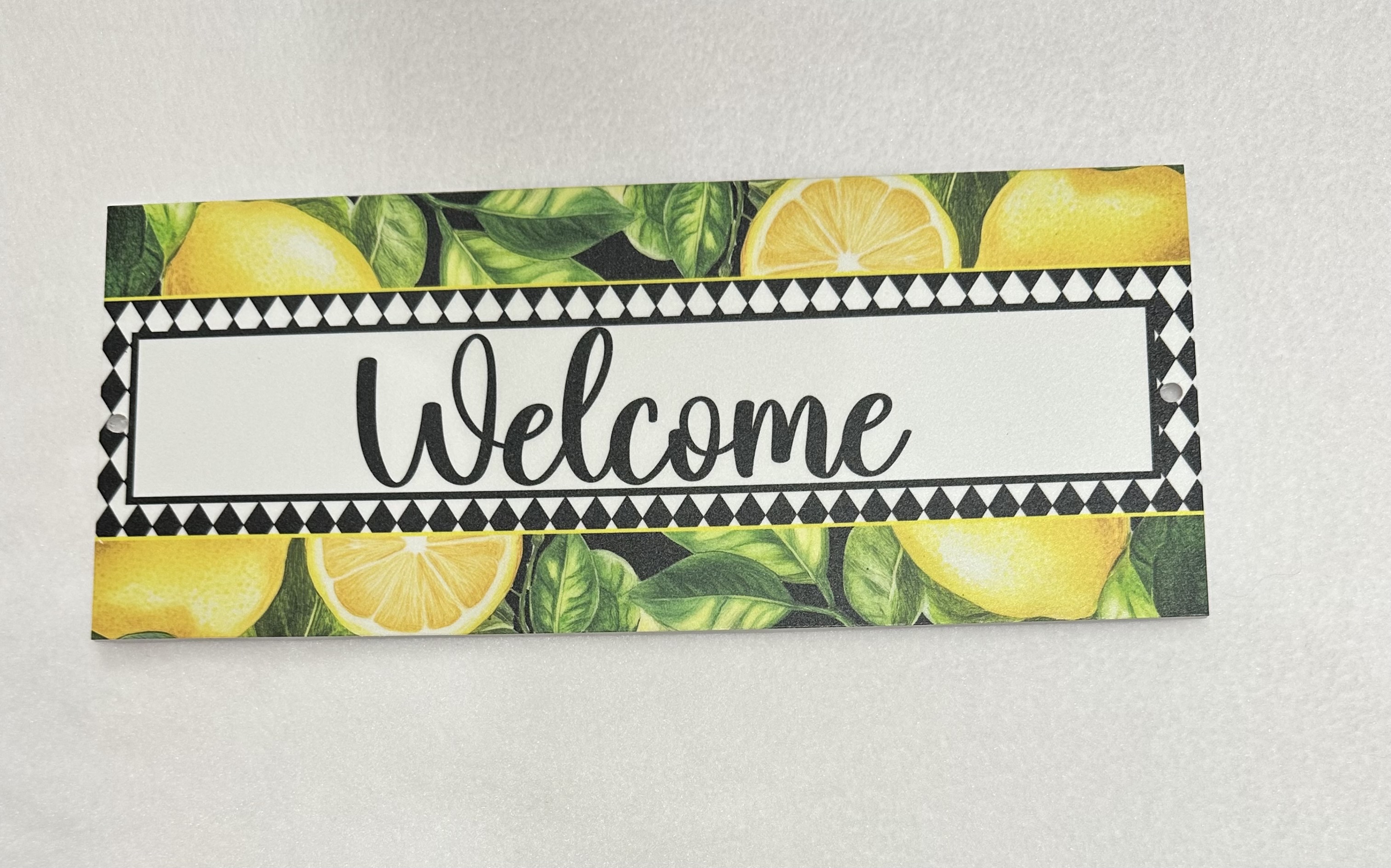 Foamex, waterproof, lightweight, UV protected plaque. Lemon background with a harlequin trim. Welcome sign also. 12inchx 5inch. Two holes to attach.