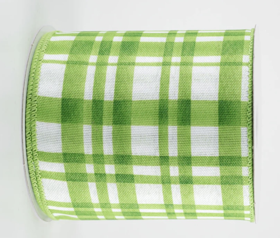 The green plaid on this white ribbon has beautiful, ombré changes to create a plaid pattern.