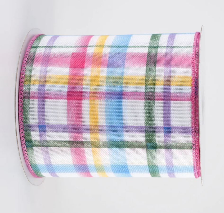 The pink, purple, blue, deep green and yellow plaid sits on white canvas.