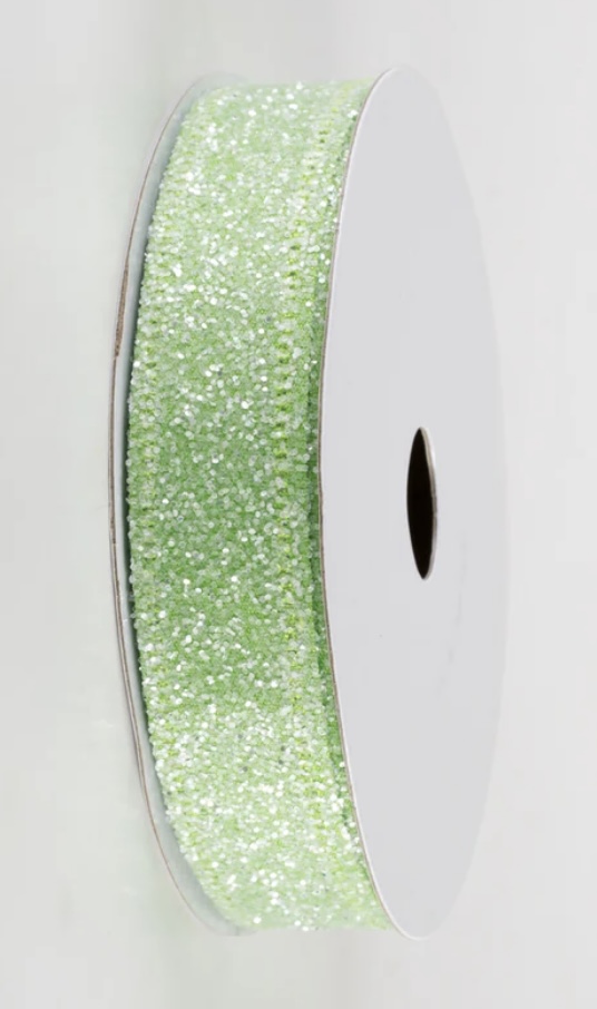 This lime green satin ribbon is lightly wired and encrusted with a generous amount of clear glitter that has mega sparkle.