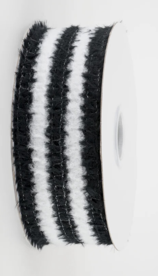 Fluffy strips of chenille are woven into a clear nylon grid creating a ribbon that is soft to the touch.
