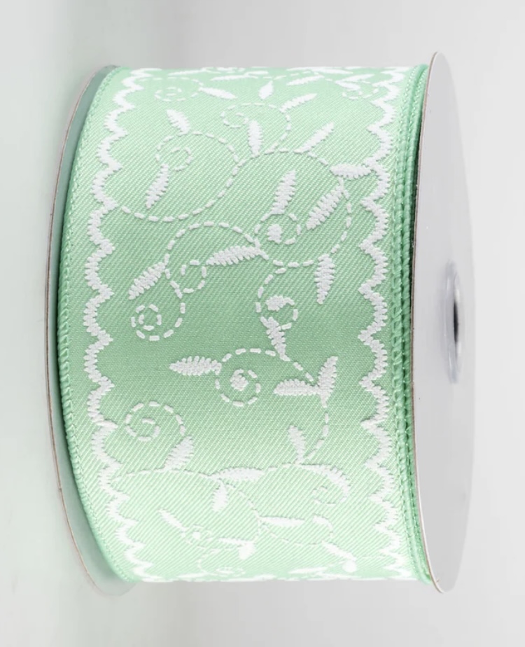 Mint green canvas ribbon uses white paint to imitate the look of stitched embroidery.