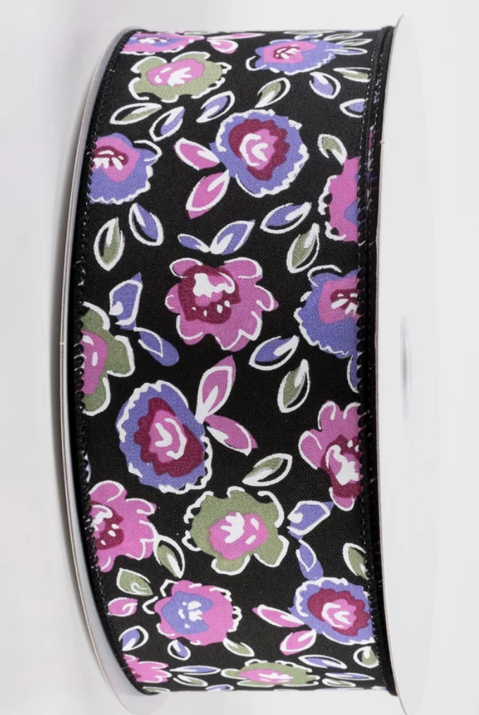 Abstract impressions of flowers appear to radiate shades of purple, pink and sage green across this black ribbon.