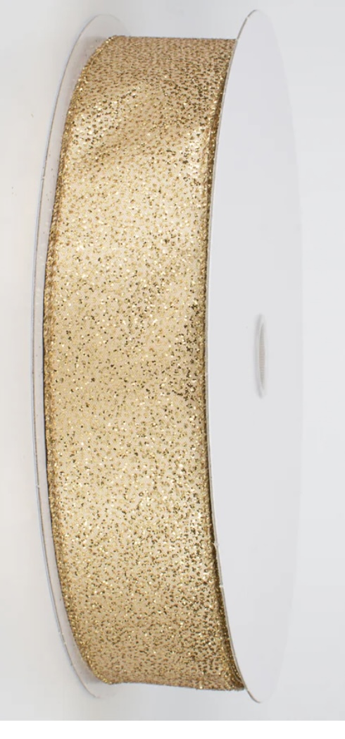 Beautiful gold polyester satin ribbon covered in miniature glitter dots in a perfectly matching color.