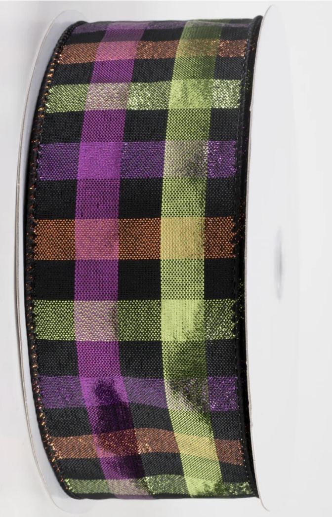 Metallic threads in orange, lime green, and purple create a shiny checkered plaid in Halloween hues.