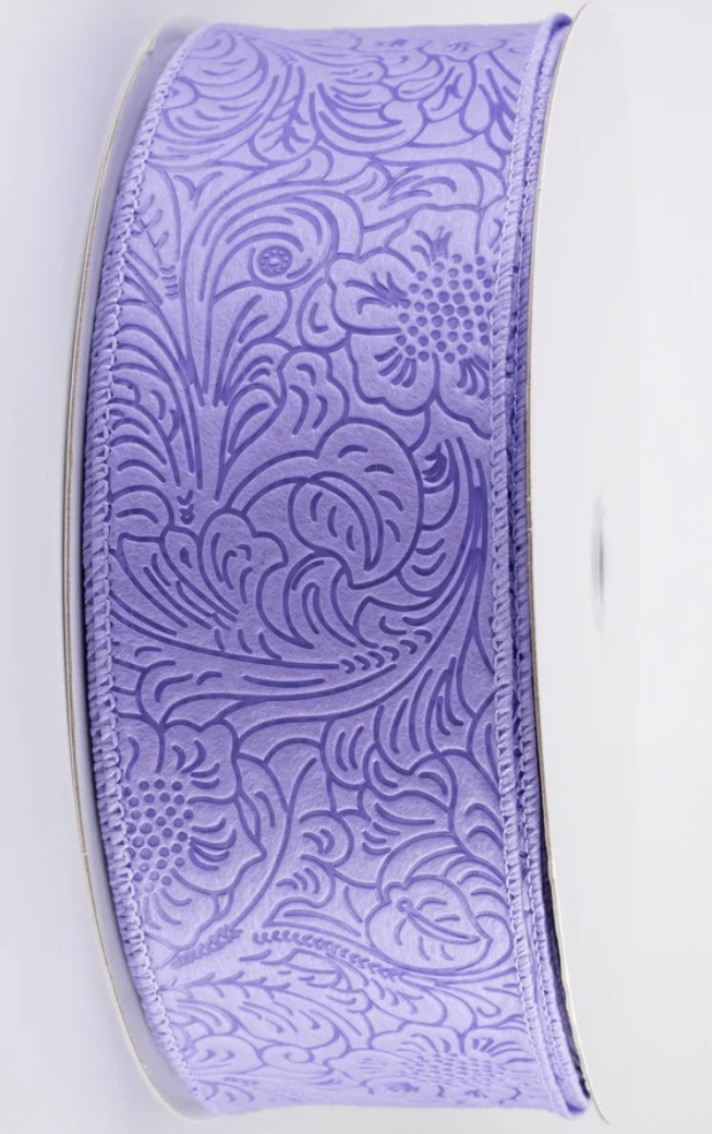 Lavender purple ribbon embossed with a floral design.