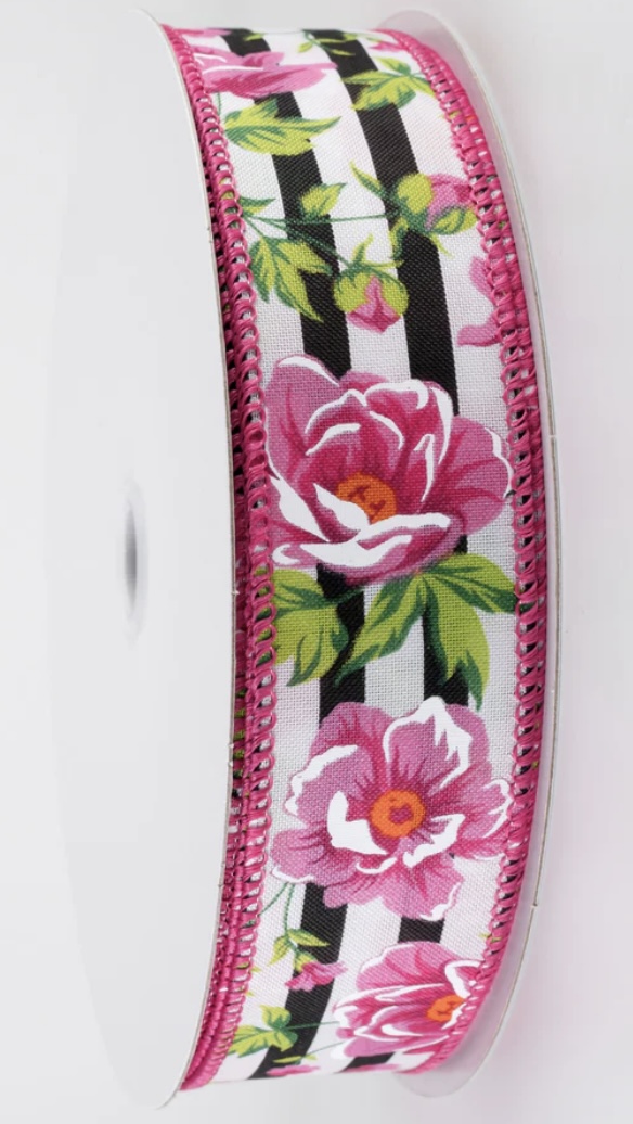 A floral pattern of bright pink peonies sits atop solid black and white stripes.