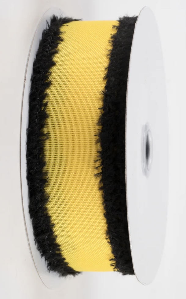 ack fuzzy edges add a textural surprise to this otherwise humble, solid yellow faux burlap ribbon.