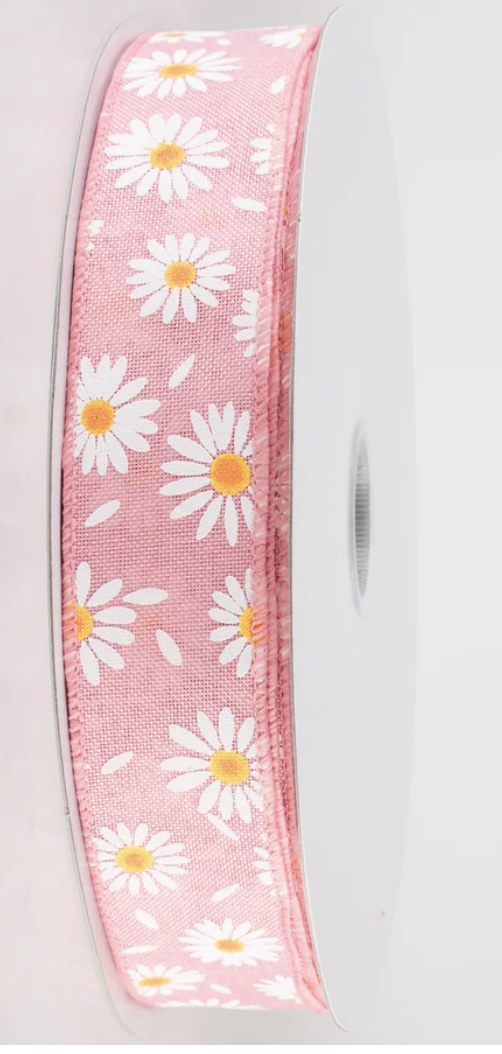 White daisies with dark yellow centers dot this pink, linen-like ribbon.
