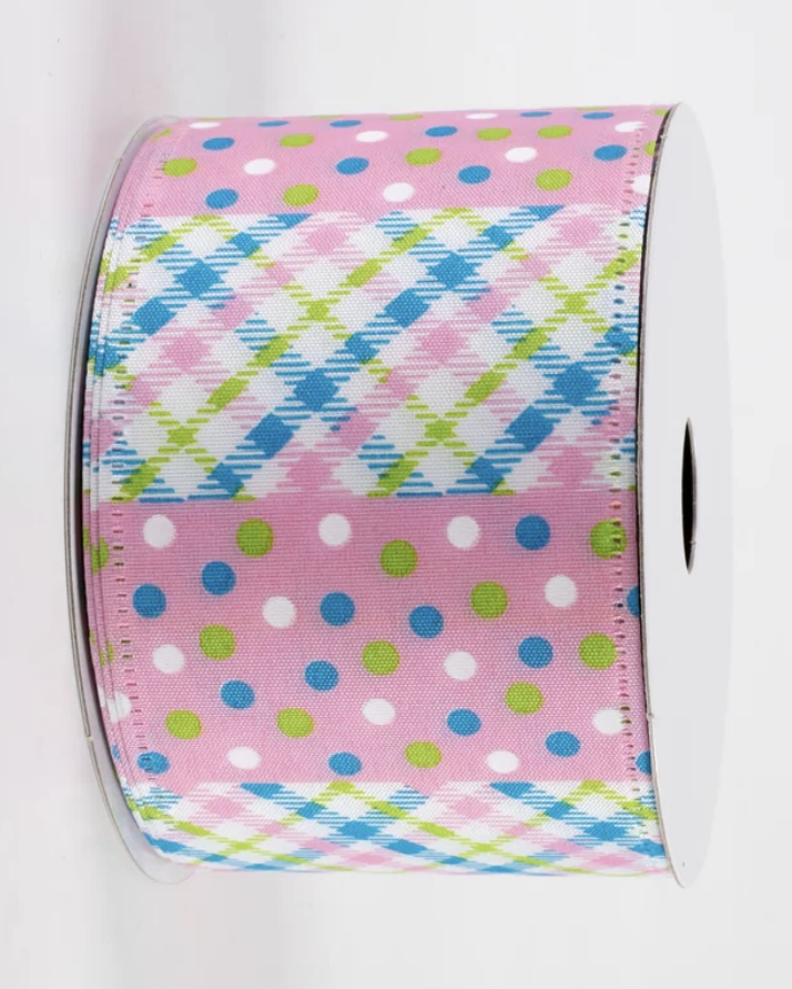 his matte satin ribbon alternates blocks of argyle plaid with blocks of polka dots.