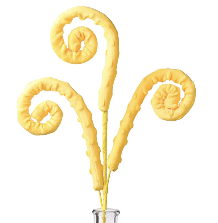 Three wired, foam tubes are curled into spirals. Each is covered with yellow fleece that has the appearance of large, 3D Swiss dots. Curl or unfurl the spirals as needed.