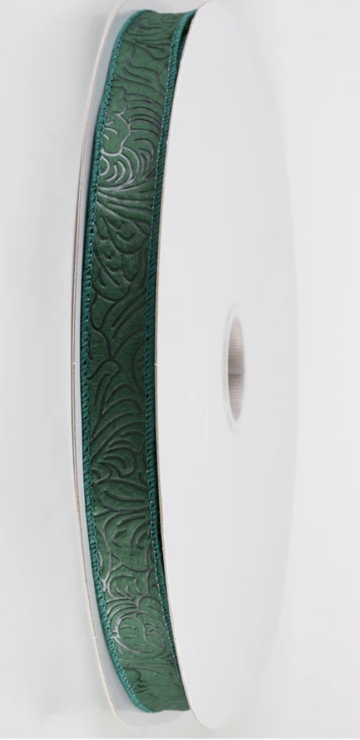 Hunter green ribbon embossed with a floral design.