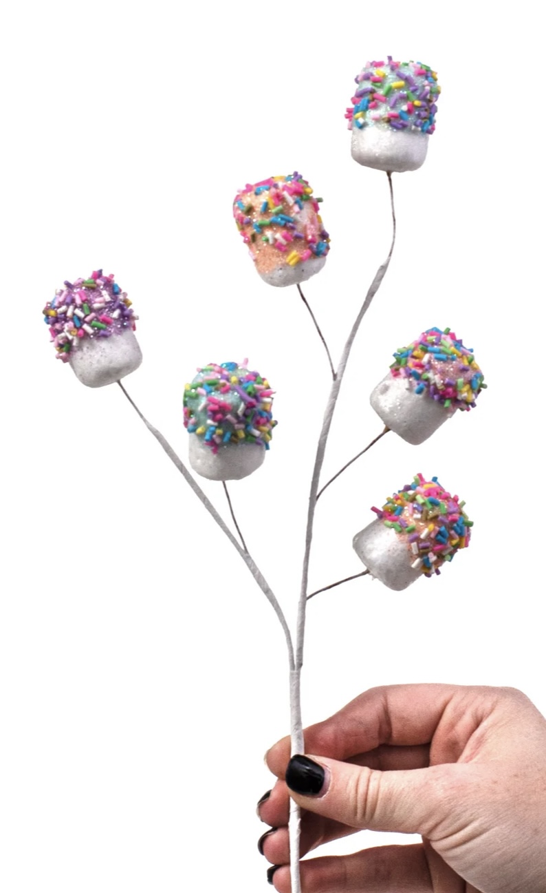 Six life-sized foam marshmallows dipped in glittered "sauce" and multi-colored "sprinkles."
