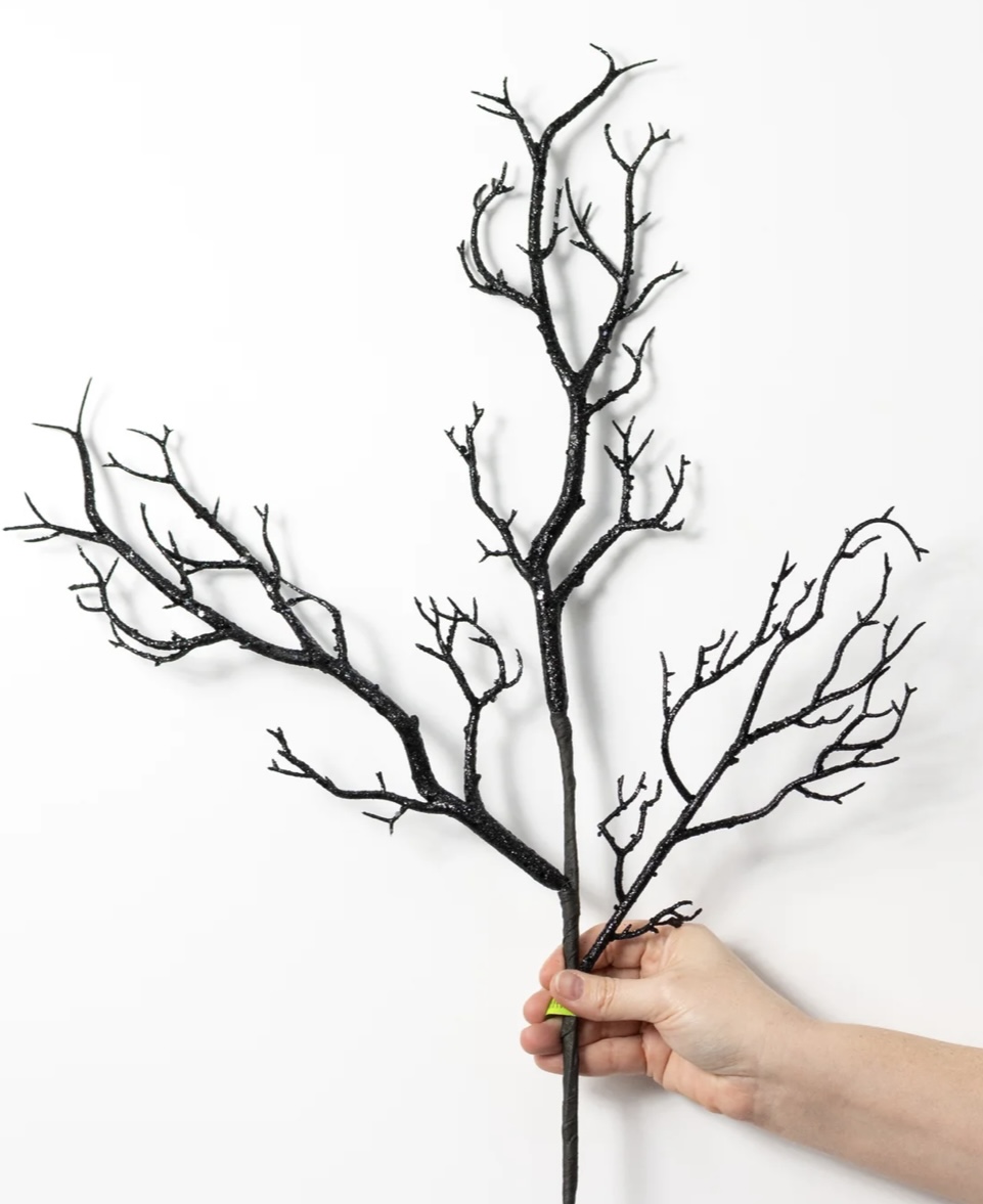 Three large sections of twigs that shimmer with an all-over coating of black glitter.