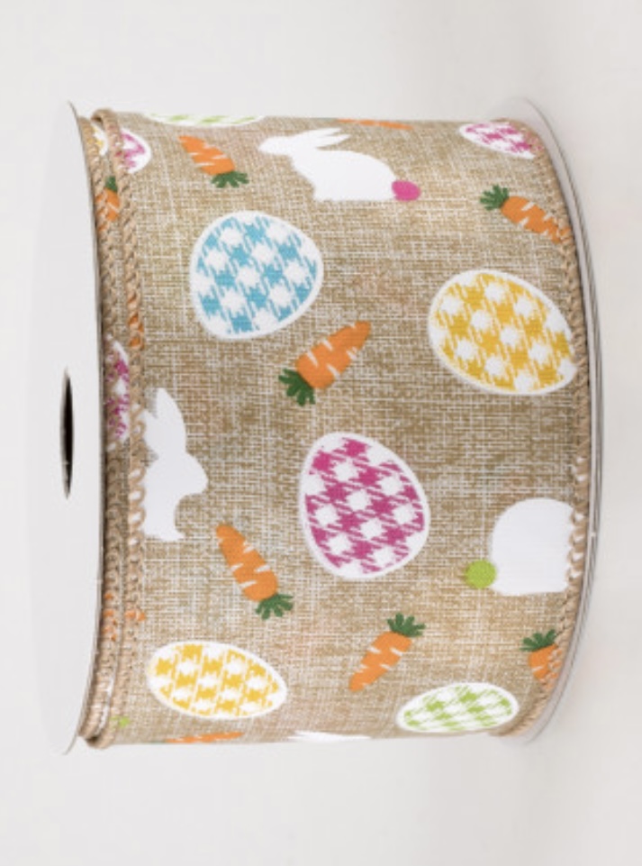 Beige canvas ribbon with checkered mixed colour eggs, carrots and bunnys.