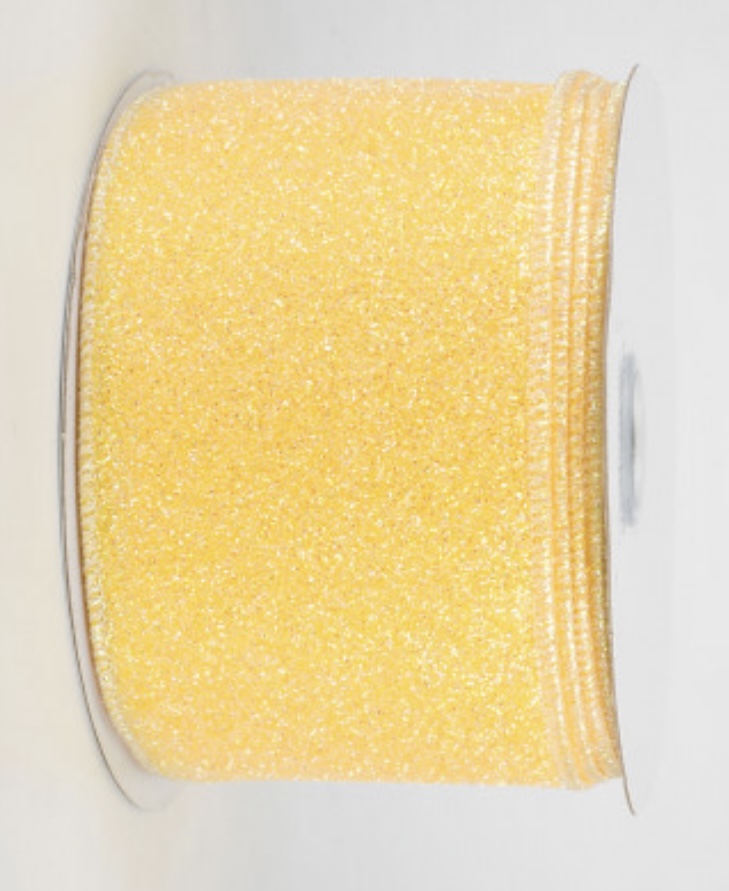 Fully glittered satin ribbon in a bright yellow with an iridescent sparkle.